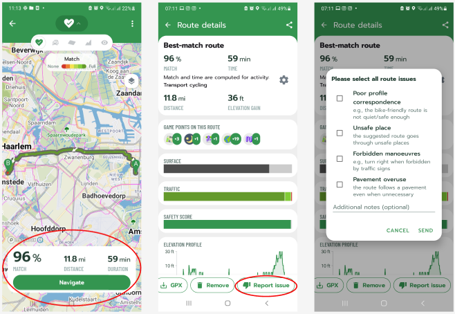 Although we are constantly working to improve the planner, there may be situations where the suggested route passes through a fenced area or a path unsuitable for bicycles. These problems usually stem from inaccurate map data.
