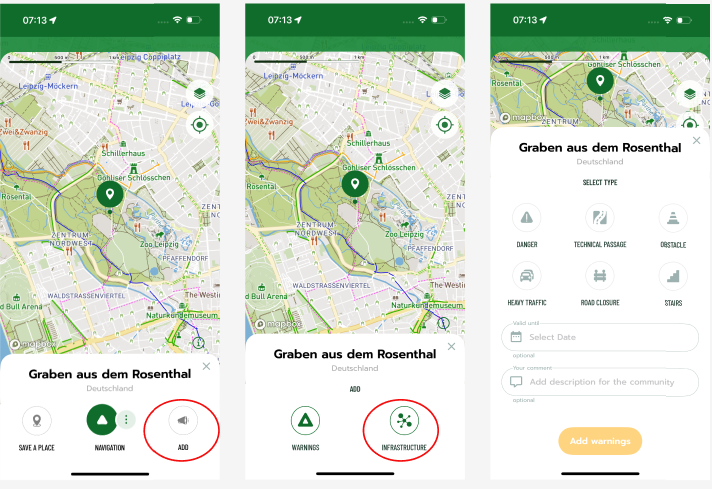 If the application leads you through impassable areas or unsuitable terrain, you can report the error directly from the route details, by long-pressing a location on the map, or by contacting us through the app.