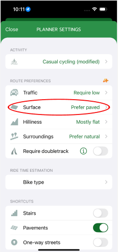 The "Require" option strictly searches only for asphalt and paved roads. The "Prefer" option prioritises high-quality surfaces but may suggest a short section on an unpaved path if no other cycle route is available.